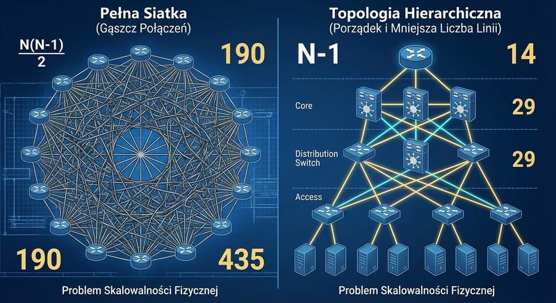 Szanowni Państwo, rozpoczynamy przedmiot poświęcony topologiom złożonych sieci komputerowych. Topologia to nie tylko fizyczny układ kabli, ale przede wszystkim logiczna struktura połączeń w sieci. W złożonych systemach, takich jak sieci kampusowe czy centra danych, topologia odgrywa kluczową rolę w zapewnieniu skalowalności, redundancji i wydajności. Będziemy analizować, jak wybór topologii wpływa na działanie protokołów i ogólne funkcjonowanie sieci.
